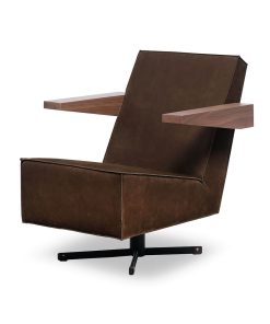 Materials: Swivel lounge chair. Wood arms in various finishes. Base in steel with a black powder-coat finish or in stainless steel. Authentic “Rietveld Original” with chip and product number. *** Black frame rotates 360 degrees with center return***
